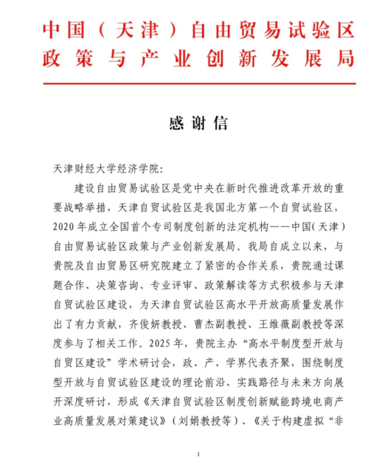 近日,中国(天津)自由贸易试验区政策与产业创新发展局向我院发来感谢信,感谢经济学院以及自贸区研究院长期以来通过课题合作、决策咨询、专业评审、政策解读等方式积极参与天津自贸试验区建设,为天津自贸试验....