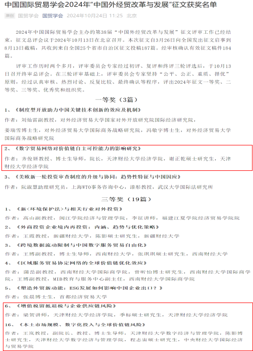 2024年11月22-23日,中国国际贸易学会年会暨国际贸易发展论坛在对外经济贸易大学隆重举行。本届年会以“建设更高水平开放型经济新体制”为主题,并进行了2024年中国国际贸易学会“中国外经贸发展与改革”征文的颁奖仪式。本年度征文活动共收到来自全国各省、自治区、直辖市征文投稿184篇,共评出论文一等奖3篇,二等奖6篇,三等奖19篇。我校2026世界杯投注网站