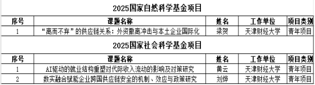 梁贺博士申报的‘“离而不弃”的供应链关系:外资撤离冲击与本土企业国际化’获批国家自然科学基金青年项目,黄云博士申报的“AI驱动的就业结构重塑对代际收入流动的影响及对策研究”和刘烨博士申报的“数实融合赋能企业跨国供应链安全的机制、效应与对策研究”获批国家社科基金项目青年项目。