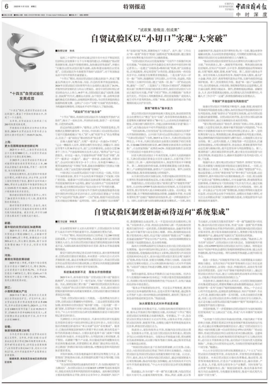 “十四五”期间,我国自贸试验区已经形成了近200项制度创新成果,门户枢纽功能持续增强,为高质量发展与区域协调发展注入动力,但当前自贸试验区建设仍面临制度创新系统集成不足、与国际高标准经贸规则存在差距、服务业开放进度缓慢等挑战。