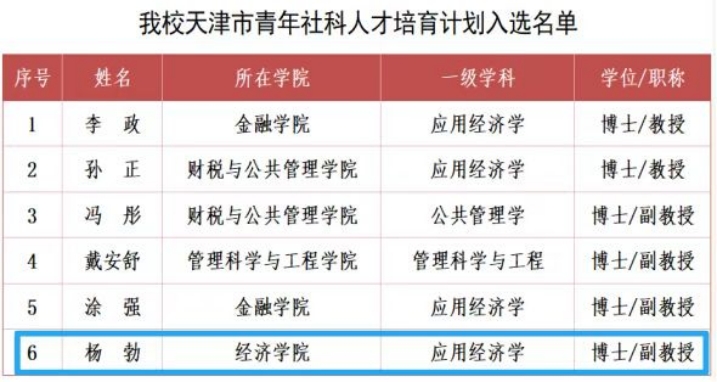 天津市青年社科人才培育计划是打造社科人才梯队的核心举措,首批遴选覆盖多学科领域青年学术骨干。杨勃副教授为经济学博士、硕士生导师,深耕国际商务、数字化与企业国际化、数字风险与治理领域,主持国家自然科学基金等多项国家级、省部级科研项目,在《中国工业经济》、《Journal of Business Research》等国内外权威期刊发表多篇论文,曾获天津市社会科学优秀成果奖、中国企业管理案例与质性研究论坛最佳论文奖,入选天津市“131”创新型人才培养工程第三层次。