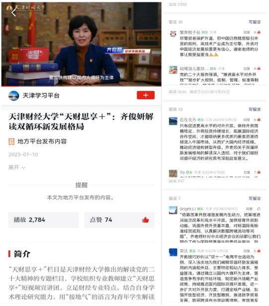 作为天津财经大学天财思享+专家团成员,利用“小而精”的网络课堂充实思政元素,引导学生正确认识中国开放型经济发展的特色和趋势,先后围绕党的二十大和中央经济工作会议以及天津港产城融合等专题进行微党课讲解四次,并被学习强国转载,使学生深刻理解中国作为世界大国的责任与大国自信,向学生讲好在复杂多变的国际经济形势下的中国开放故事。