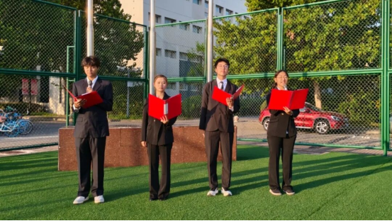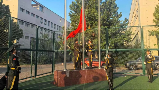天财国旗护卫队踏着铿锵且整齐划一的步伐,执旗昂首阔步入场。当雄浑嘹亮的国歌奏响,鲜艳的五星红旗在晴空下沿旗杆徐徐攀升。全场师生昂首挺胸,目光灼灼地追随着国旗的轨迹,行注目礼。这一刻,心中涌动的不仅是对祖国发展征程的崇高敬意,更是一次爱国主义情怀的热烈激荡与升华。