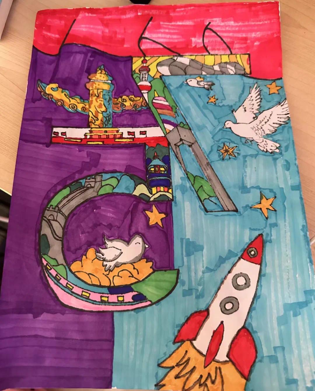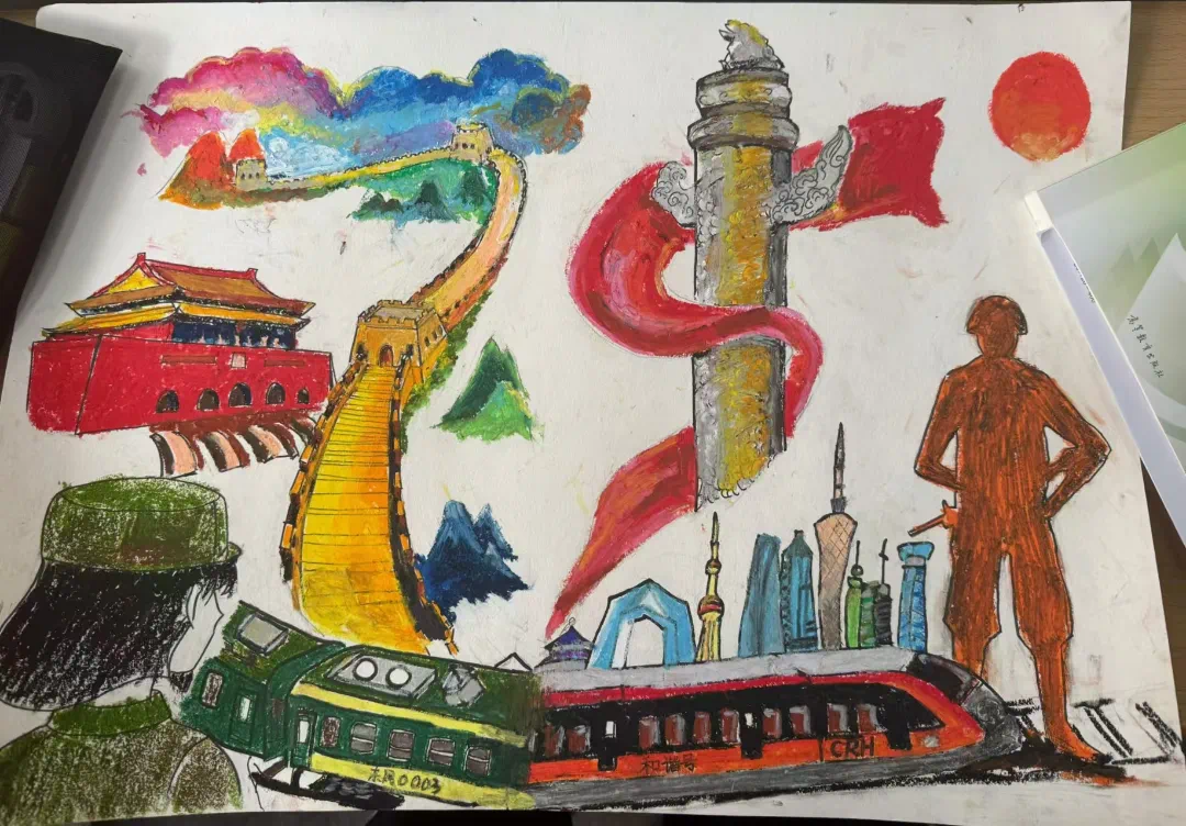 学员们以白鸽象征和平,以火箭象征发展,将长城与高铁串联在一起,用对比的形式展现了近年来中国快速的发展。作品主题鲜明突出,在许多细节处展现时代的变化。小组成员们也在团结协作中,共同感受到了新中国的日新月异。
