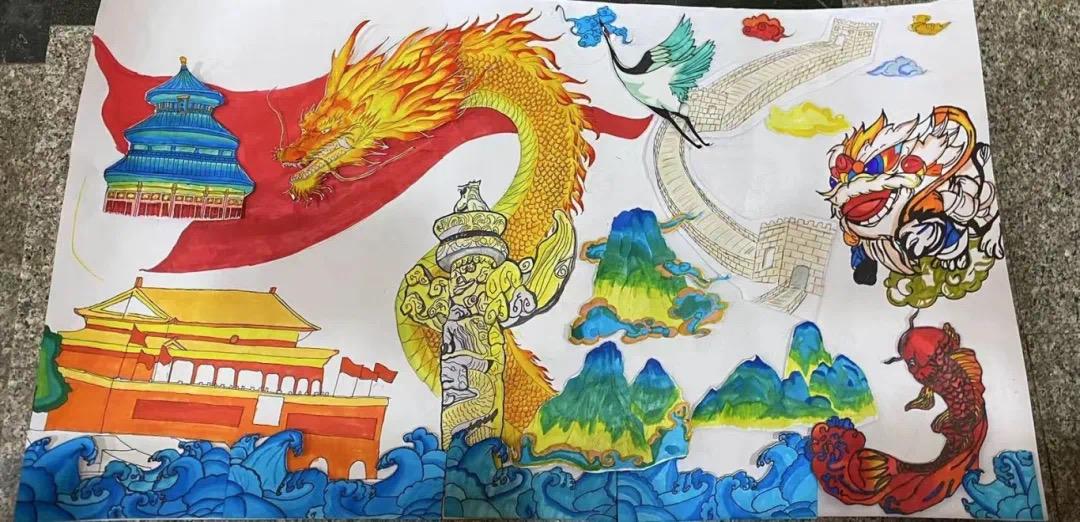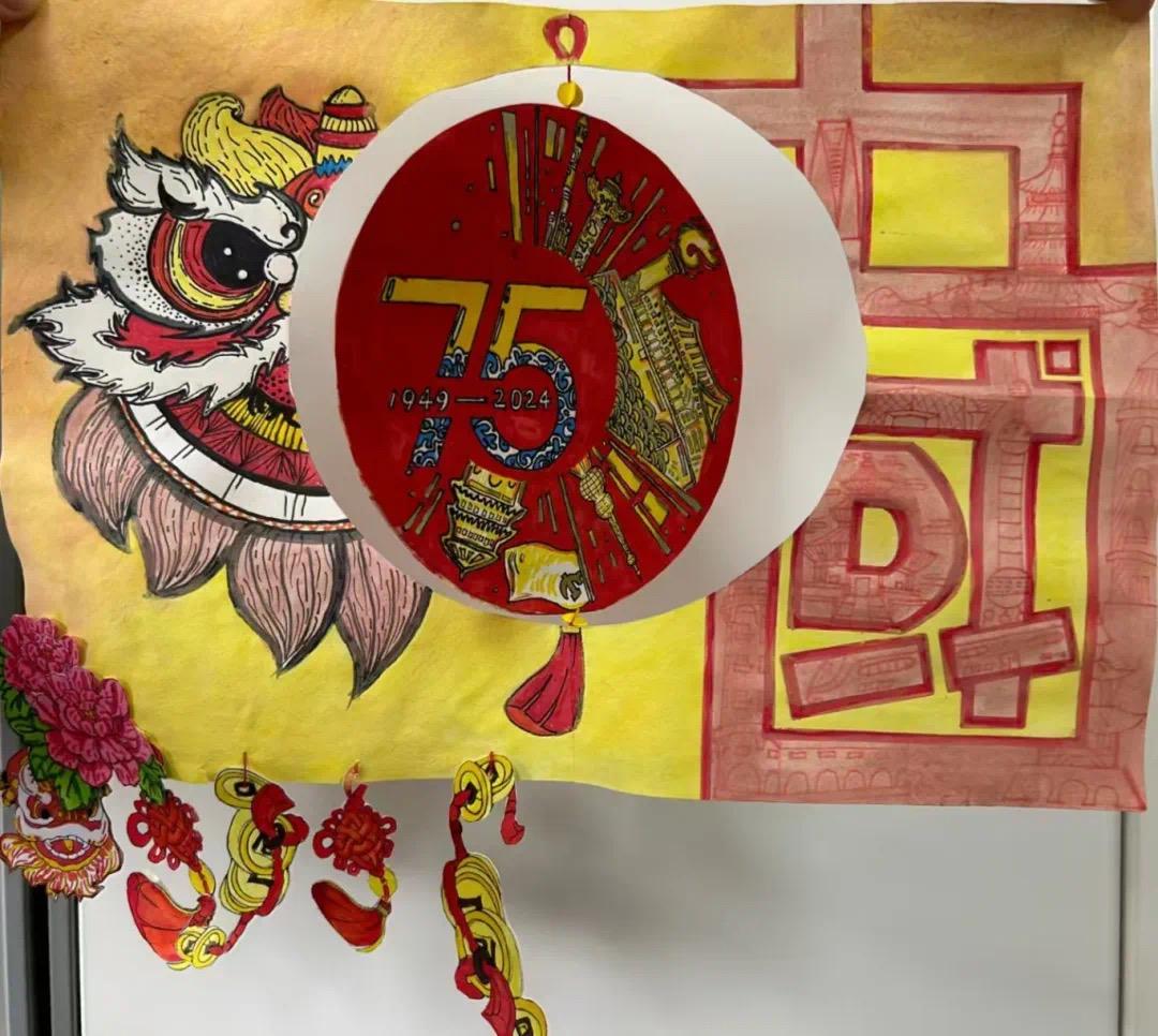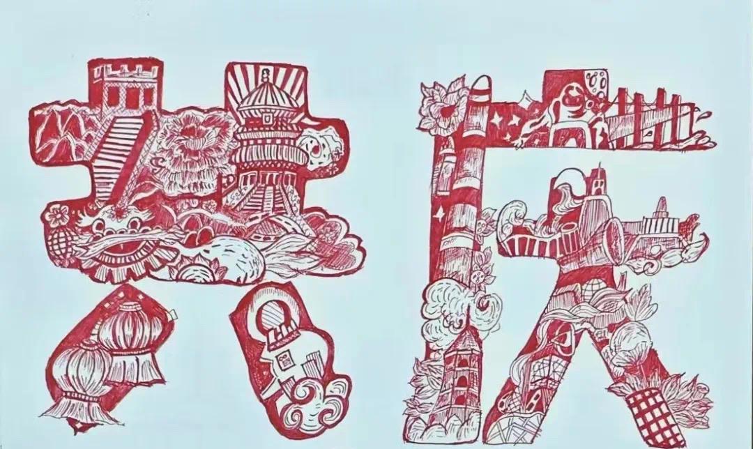 这是一幅精致细腻的画卷,学员们用新颖的笔触勾勒出剪纸的形态,又以许多充满中国意象的图案共同拼凑成共庆二字,给人以深深的震撼。飞扬的巨龙、飘扬的红旗、盛放的牡丹花、发射升空的火箭……小组成员们选取了诸多意象描绘了蓬勃发展的祖国。