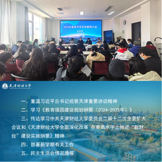 会上,韩书记带领全体教职工重温习近平总书记视察天津重要讲话精神,学习传达了《教育强国建设规划纲要(2024-2035年)》和中共天津财经大学委员会二届十二次全委扩大会议精神,并以《全面深化改革 加快推进学院创新发展》为题作理论与形势政策宣讲。韩书记要求全体教师要认真贯彻落实党的教育方针,聚焦数智时代“新财经”建设,积极响应学校全面深化改革的号召,齐心协力、众志成城,求真务实、担当作为,以改革创新的精神、精益求精的态度、团结协作的作风全力完成好新一年的各项工作任务。