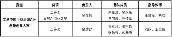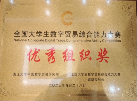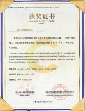 全国大学生数字贸易综合能力大赛由浙江大学中国数字贸易研究院主办,已连续成功举办四届,累计吸引1213所高校、60000余名师生参与。本届大赛的义乌中国小商品城AI+创新创业赛道深度联合义乌中国小商品城大数据公司,基于义乌小商品市场的商贸资源和Chinagoods平台的数字贸易基础设施,鼓励大学生与市场企业深度链接。赛事自20251月启动以来,吸引了全国309所高校的2279支团队、10229名学生参赛。其中,我校由金立智等五名同学组成的第五象限突击队荣获该赛道二等奖及义乌AI创业之星奖;金瑜珍等五名同学组成的e先锋队同样荣获赛道二等奖。
