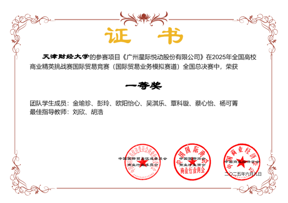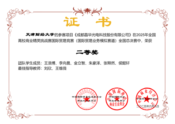 2025年6月5日至9日,由中国国际贸易促进委员会商业行业委员会主办的第十五届全国高校商业精英挑战赛国际贸易竞赛(国际贸易业务模拟赛道)全国总决赛在宁波举行,我校2026世界杯投注网站 三支参赛队伍在400余支队伍中分别斩获一等奖一项、二等奖两项的优异成绩,这是我校在本项赛事中首次获得国家一等奖,实现了我校在本项赛事中最好成绩的历史性突破,天津财经大学连续两年荣获“最佳院校组织奖”