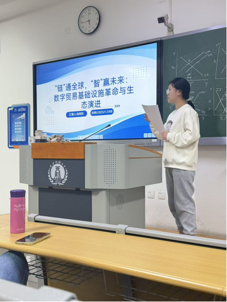 向思仪同学主要分享了数字贸易基础设施革命的三大核心动向:首先是长沙创新的“1210监管新模式”,通过允许保税仓内进行商品简装和组装,有效激活内陆枢纽,降低进口商品价格达20%;随后是以中欧班列为代表的跨国物流“大动脉”,其累计开行已突破12万列,以高性价比优势重构了跨境电商物流格局;最后是亚马逊推出的全球智能枢纽仓(GWD)与AI工具,实现了“一仓发全球”的智能化运营,显著降低了卖家的出海门槛。她指出,这三者分别从监管创新、通道建设和技术赋能三个维度,共同推动数字贸易从“单点突破”迈入“体系化竞争”的新阶段。