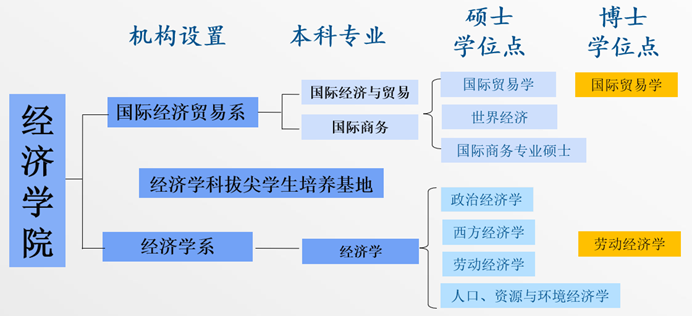 在国际贸易学和劳动经济学2个二级学科招收博士研究生,在国际贸易学、政治经济学等6个二级学科招收学术学位硕士研究生,并招收国际商务硕士(MIB)专业学位研究生。