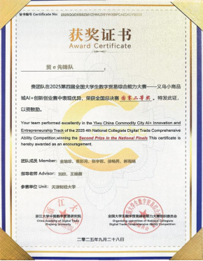 全国大学生数字贸易综合能力大赛由浙江大学中国数字贸易研究院主办,已连续成功举办四届,累计吸引1213所高校、60000余名师生参与。本届大赛的义乌中国小商品城AI+创新创业赛道深度联合义乌中国小商品城大数据公司,基于义乌小商品市场的商贸资源和Chinagoods平台的数字贸易基础设施,鼓励大学生与市场企业深度链接。赛事自20251月启动以来,吸引了全国309所高校的2279支团队、10229名学生参赛。其中,我校由金立智等五名同学组成的第五象限突击队荣获该赛道二等奖及义乌AI创业之星奖;金瑜珍等五名同学组成的e先锋队同样荣获赛道二等奖。