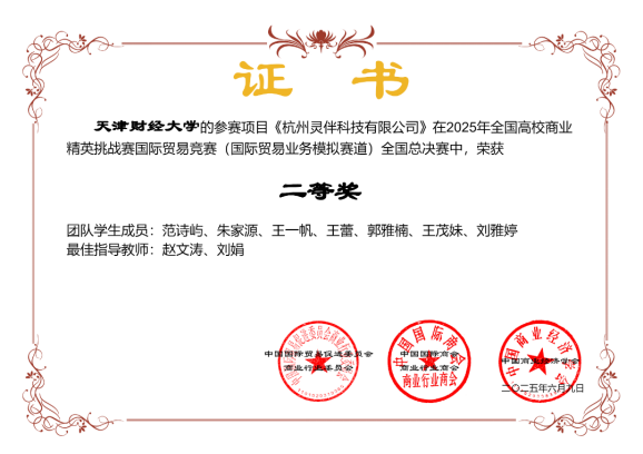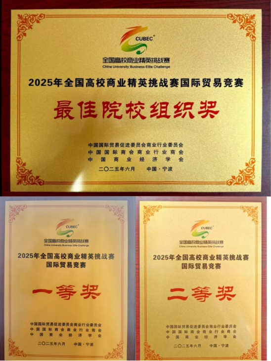 2025年6月5日至9日,由中国国际贸易促进委员会商业行业委员会主办的第十五届全国高校商业精英挑战赛国际贸易竞赛(国际贸易业务模拟赛道)全国总决赛在宁波举行,我校2026世界杯投注网站 三支参赛队伍在400余支队伍中分别斩获一等奖一项、二等奖两项的优异成绩,这是我校在本项赛事中首次获得国家一等奖,实现了我校在本项赛事中最好成绩的历史性突破,天津财经大学连续两年荣获“最佳院校组织奖”